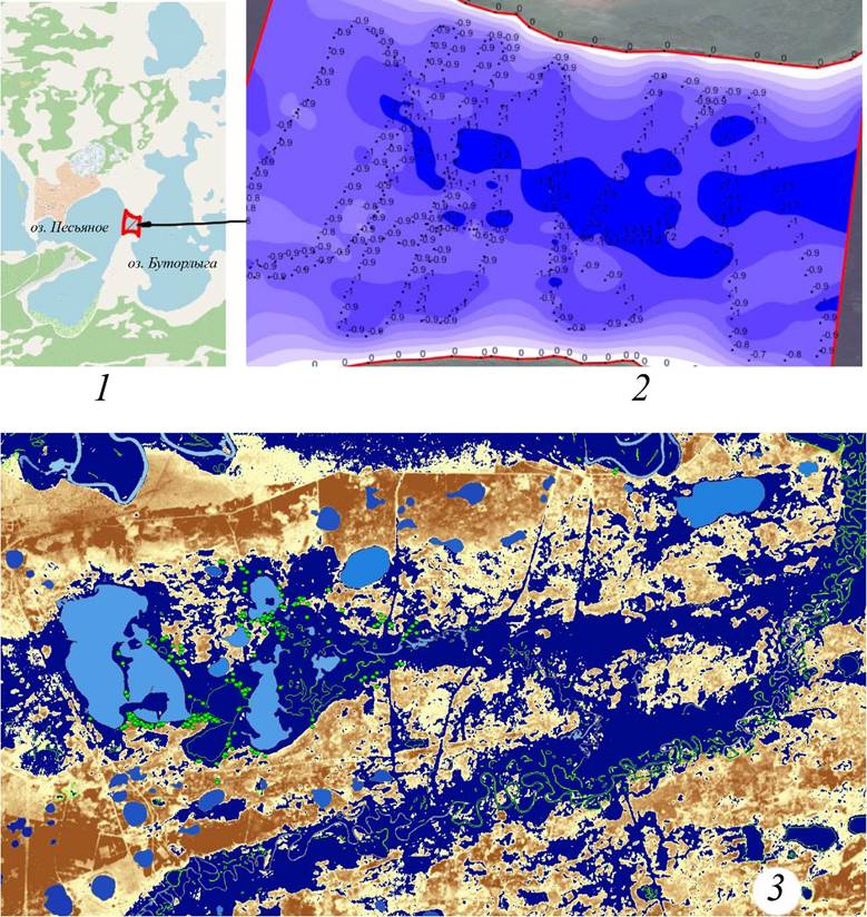Рисунок 5 – Материалы к гидрологии системы Андреевских озер. 1 – место батиметрических исследований; 2 – глубины переймы между озерами Песьяное и Буторлыга (по Н.В. Приходько); 3 – компьютерная модель ложбин древнего стока. Уровень подтопления – 57 м (по О.С. Сизову)