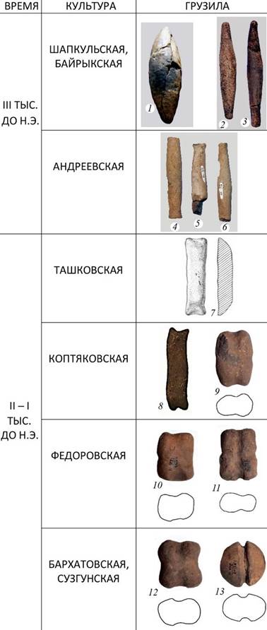 Образ водоплавающей птицы широко встречается в искусстве древнего населения северо-западных и северо-восточных областей Восточной Европы и Западной Сибири. Не случаен, на наш взгляд, факт сосуществования в пределах III – начала II тыс. до н.э. рассматриваемых грузил и изображений на посуде и на писаницах Урала. Изображения птиц начала периода достаточно реалистичны. В конце же, когда в комплексах, например, коптяковской культуры, присутствуют как рожковидные, так и подпрямоугольной формы грузила с одним, а позже и двумя перехватами для крепления [27; 31], изображения становятся крайне стилизованными, в виде ряда Z-образных и зеркальных им фигур [32, рис. 7: 9]. С появлением производящего хозяйства на территории Тоболо-Ишимья грузила биконической, сигаровидной и рожковидной форм, характерные для начального периода эпохи раннего металла (III – начала II тыс. до н.э.), полностью исчезают. В последующие, федоровский и позднебронзовый периоды, в комплексах пахомовской, бархатовской и сузгунской культур начинают доминировать глиняные изделия подпрямоугольной формы с одним или двумя перехватами или дисковидные с одним перехватом для крепления бечевы. Вопрос о том, какова была основа для их типологического развития, требует разработки, но не исключено, что прообразом грузил подпрямоугольной формы являлись рожковидные изделия, у которых сократилась длина, увеличилась ширина и изменилась форма сечения.