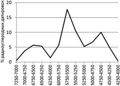 Для этой цели автором была составлена хронологическая таблица (табл. 1), в которой были учтены даты, полученные по елшанской керамике лесостепного Заволжья, т.е. той территории, культурная принадлежность памятников которой ни у кого не вызывает вопросов. Распределение радиоуглеродных даты в таблице представлено графически по периодам продолжительностью в 125 лет. Каждый период представляет собой одну статистическую единицу. Для того чтобы уравнять значимость «коротких» и «длинных дат», для каждой из них был вычислен коэффициент сопряженности. Его величина зависела от того, сколько периодов охватывал калиброванный интервал радиоуглеродной даты, на число которых каждая дата делилась. У дат с наибольшими погрешностями этот коэффициент составлял 0,14 (единица, деленная на 8 периодов), с наименьшими – 0,5 (единица, деленная на 2). После чего с учетом данных коэффициентов была подсчитана частота встречаемости радиоуглеродных дат для интервалов протяженностью в 250 лет, информация о которой для наглядности была переведена в проценты и представлена в виде графика.