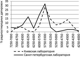 Рисунок 2 – График радиоуглеродных датировок керамики елшанской культуры, выполненных в киевской и санкт-петербургской лабораториях