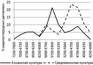 Судя по графику соотношения радиоуглеродных елшанской и средневолжской культуры, средневолжская керамическая традиция приходит на смену елшанской на хронологическом отрезке 5500–5250 cal ВС.