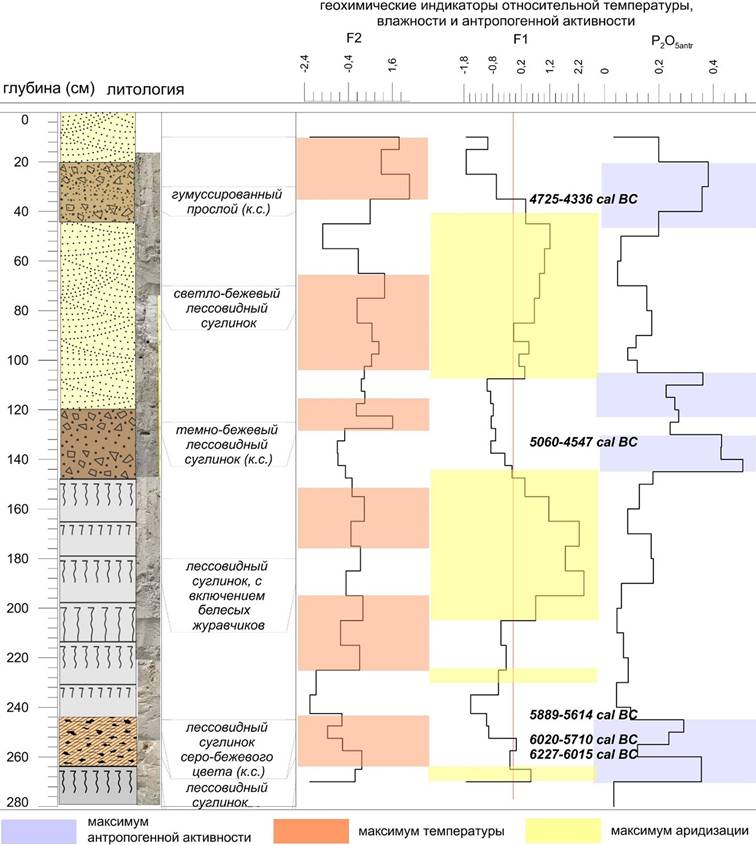 На памятнике была проведена реконструкция изменения палеоклимата. Первые свидетельства носителей орловской культуры фиксируются на глубине 280–270 см (рис. 8). Отложения на этом этапе происходили в период окончания прохладного и сухого эпизода при переходе к умеренно влажным и теплым условиям. На глубине 260–240 см фиксируется высокая антропогенная активность при теплых и влажных условиях. Выше антропогенная активность снижается. Слой, следующий за орловским, является стерильным. Здесь фиксируется максимальная аридизация климата и высокая температура.