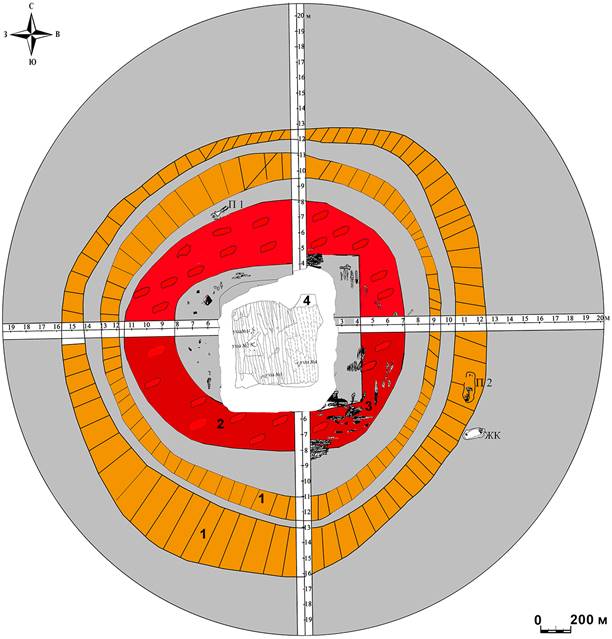 Рисунок 2 – План кургана № 6. 1 – глиняный кольцевой вал; 2 – прокаленный вал, выложенный из сырцовых блоков; 3 – фрагменты бревенчатого надмогильного перекрытия; 4 – центральная яма. ЖК – жертвенный комплекс, П 1 – погребение 1, П 2 – погребение 2