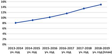 Курсы успешно проводились с 2013 года, причем процент обученных преподавателей неуклонно рос (за счет уменьшения общего количества профессорско-преподавательского состава). Динамика представлена на рис. 6.