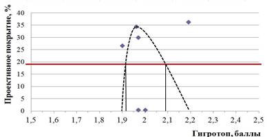 Следующим шагом было составление графика зависимости проективного покрытия от значения гигротопа. Проведя огибающую кривую к полученным точкам (пунктирная линия), и найдя среднее от проективного покрытия (18%), можно провести линию с найденным средним значением (жирная линия), которая пересекает огибающую кривую в двух точках с координатами, между которыми находится синэкологический оптимум. В нашем случае выявленный оптимум равен 1,92–2,09 баллов, что означает «мезофит» согласно работе Н.М. Матвева [21]. Отметим, что полученные результаты согласуются с литературными [25, 26, 27].