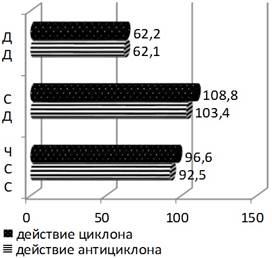 В ходе исследования деятельности сердечно-сосудистой системы во время антициклона установлено, что средняя ЧСС детей без учёта половых различий составила 92,5±6,5 уд/мин., средняя величина систолического давления – 103,4±6,7 мм. рт. ст., диастолического – 62,1±3,0 мм. рт. ст., что соответствует стандартным величинам этих показателей для детей данной возрастной группы в условиях нормального атмосферного давления [7; 11]. При повторном снятии перечисленных показателей в условиях циклонических влияний нами был зафиксирован прирост величин СД, в среднем по выборке на 5,2%, что подтверждает данные [7; 12] об увеличении артериального давления при понижении атмосферного. С этим фактом мы увязываем и компенсаторный рост частоты сердечных сокращений, в среднем на 4,1 уд/мин. В то же время средние величины ДД претерпели незначительные изменения, в рамках погрешности измерений (рисунок 1), что так же согласуется с данными ряда авторов [7; 12] о низкой лабильности этого показателя.