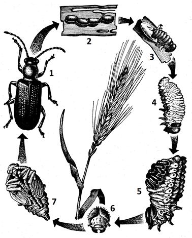 Рисунок 1 – Схема генерационного цикла листоеда – пьявицы красногрудой (Oulema melanopus) (ориг.): 1 – жук, 2 – кладка яиц и погрызы листа, 3 – личинка 1-го возраста (в момент выхода из яйцевой камеры), 4 – личинка 2-го возраста, 5 – личинка 3-го возраста, 6 – головная капсула личинки 4-го возраста, 7 – куколка. В центре цикла – кормовой объект – растение пшеницы