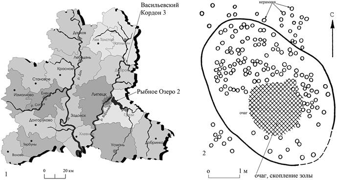 Рисунок 1 – 1 – местоположение памятников с постройками раннего неолита на карте Липецкой области; 2 – план постройки с поселения Рыбное Озеро 2 (по В.П. Левенок, 1973)