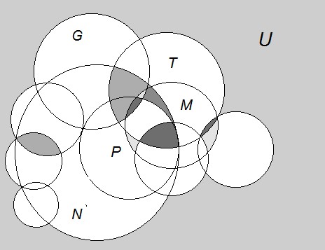 Составляющую мировоззренческой подготовки М, формируемую при изучении математики, закономерно считать подмножеством множества U. Подмножествами U можно считать и другие составляющие мировоззренческой подготовки. К ним можно отнести гуманитарную G, научную N, техническую T, прикладного характера P, бытовую B и другие составляющие. Эти подмножества могут объединяться и пересекаться причудливым образом, образуя новое интегрированное знание (рис. 2). Множество, относительно которого все множества, рассматриваемые в задаче, являются подмножествами, называется универсальным. В рассматриваемом случае универсальным является множество U, соответствующее мировоззренческому компоненту метапредметной компетентности. Его принято обозначать буквами U или I и изображать в виде прямоугольника на диаграммах Эйлера-Венна.