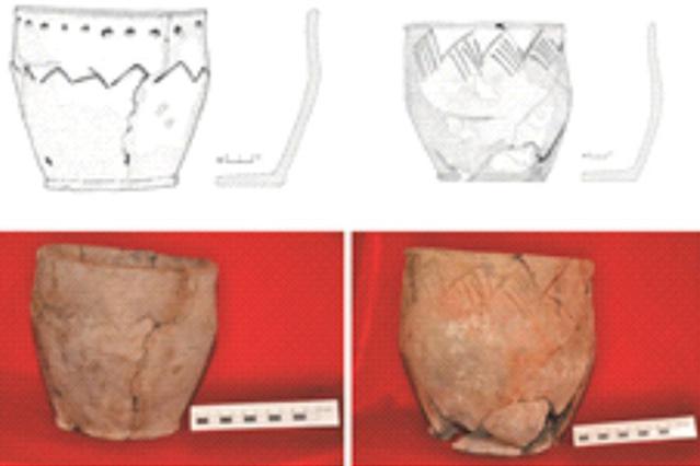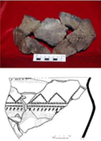 Керамика срубной культурно-исторической общности является достаточно стандартизированной (орнамент представлен зубчатым штампом, насечками, прочерченными линиями, ромбами, открытыми треугольниками, семечковидными вдавлениями). В контактной зоне смешения двух групп населения срубного и андроновского (алакульского) выявлены сосуды со знаками (зооморфные пиктограммы, сложные знаковые фигуры). Морфологический анализ сосудов позволил выделить на памятниках сосуды трех групп: срубной археологической культуры, андроновской (алакульской) археологической культуры и миксовые сосуды – срубно-алакульские.
