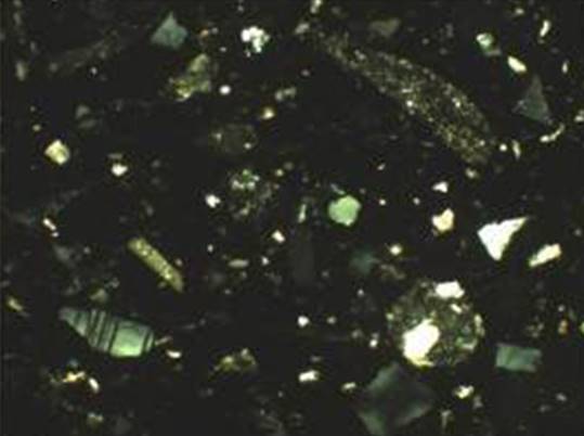 Рисунок 10 – Микрофотографии тонких срезов (шлифов) керамического материала. Снимок сделан в поляризационном пересечении. Ширина изображения: 1,45 мм. Образец 2 – поляризационное пересечение