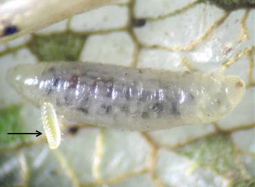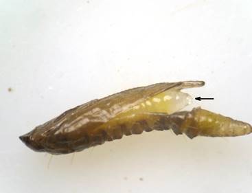 Рисунок 2 – Развитие личинки наездника Minotetrastichus frontalis (указана стрелкой) на хозяине