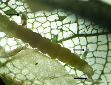 Рисунок 4 – Совместное развитие двух личинок наездника Minotetrastichus frontalis (указаны стрелками в правой части фото) и Sympiesis gordius (указан стрелкой в левом верхнем углу фото) на гусенице липовой моли Phyllonorycter issikii