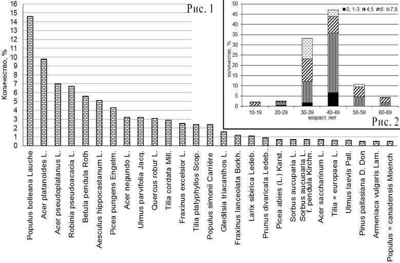 Доминантами из древесных пород в насаждениях являются: Populus bolleana Lauche (14,6% от общего количества деревьев), Acer platanoides L. (9,8%), A. pseudoplatanus L. (7,0%), Robinia pseudoacacia L. (6,7%), Betula pendula Roth (5,6%), Aesculus hippocastanum L. (5,1%), Picea pungens Engelm. (4,3%), Acer negundo L. и Ulmus parvifolia Jacq. (по 3,2%), Quercus robur L. (3,1%), Tilia cordata Mill. (2,9%), Fraxinus excelsior L. (2,5%), Tilia platyphyllos Scop. и Populus simonii Carrière (по 2,4%), остальные породы – менее 2,0% (рис. 1). Небольшим количеством экземпляров (до 10) представлены 45 (42% от общего количества) видов, форм и сортов деревьев, единичными растениями (1–5) представлены Abies alba Mill., Acer platanoides ‘Сrimson King’, Betula pendula f. youngii (Th. Moore) C.K. Schneid, Carpinus betulus L., Corylus colurna L., Juglans nigra L., Picea glauca (Moench) Voss, Pinus strobes L., P. sylvestris L., Populus canescens Smith, Styphnolobium japonicum (L.) Schott, Ulmus glabra Huds. f. pendula (Loudon) Rehder, виды рода Magnolia L.