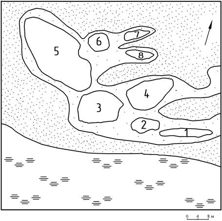 Самые интересные и многочисленные находки каменных артефактов обнаружены в окрестностях с. Новая Казанка. Село окружено тремя довольно крупными озерами-сорами: Айдын, Сорайдын, Раим. Озера пересыхающие. Все эти водоемы окружены песчаными массивами (дюнами). Наиболее высокие – до 10 м – песчаные барханы располагаются на западном берегу озера Сорайдын. Песчаная поверхность района испещрена пересыхающими озерами, протоками, понижениями с сорами, частично перевеяна. В 2003 году были выявлены скопления каменных артефактов в котловинах выдувания на окраине песчаных барханов на западном берегу озера Сорайдын [5]. К 2005 г. площадь оголенных участков в котловинах выдувания увеличилась. Стал возможен сплошной сбор артефактов на 8 отдельных участках с оголенной поверхностью (пункты сбора 1–8) (рис. 1). Перепад высот между ними составляет около 2 м.