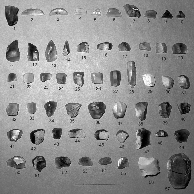 Среди артефактов из кремнистых пород примечательны 4 геометрических микролита – сегменты – два целых и один фрагментированный с односторонней обработкой дуги, и асимметричная трапеция с противолежащей ретушью на краях. Орудия разнообразны: пластины с ретушью одного края, с двумя ретушированными краями и с усеченным ретушью концом; концевые скребки на пластинах и отщепах, резец на фрагменте скребка, острие на пластине, микропластинка с выделенным клювиком и др.