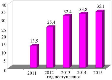 С целью определения реального уровня здоровья студентов был проведён анализ медицинской и учебной документации за период с 2011 по 2015 гг. в ДИТИ НИЯУ МИФИ. В результате выявлено, что ежегодно увеличивается количество поступающих в данный вуз абитуриентов с нарушениями физического состояния здоровья, что свидетельствует о факте начала негативных изменений в организме молодых людей ещё в подростковом возрасте. В частности, если в 2011 г. к СМГ было отнесено 13,5% первокурсников, то в 2015г. – уже 35,1% (рис. 1).