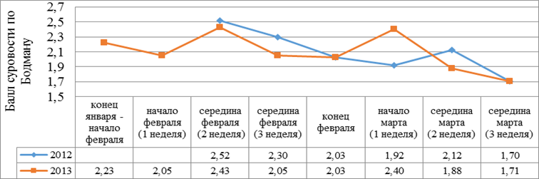 Средний балл суровости за 2012–2013 гг. составлял 2,10 балла для каждого из сезонов, наиболее сильно среди всех параметров отличалась высота снежного покрова (для 2013 г. он составил в среднем 40,55 см, для 2012 г. – 70,38 см). По полученным для недель троплений данным был построен график (рис. 1.).