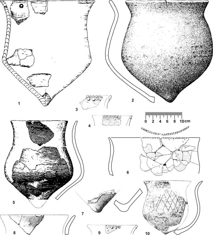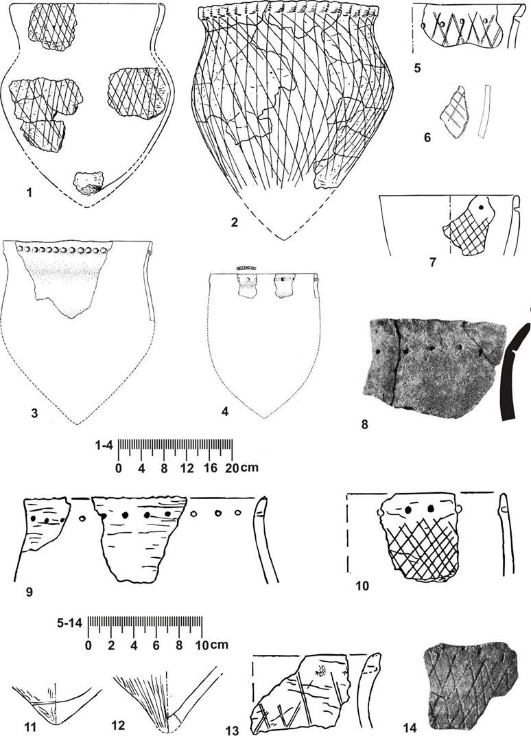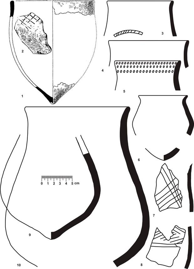 В Поднепровье сходная керамика представлена в первом периоде волынской культуры. Так, в материалах стоянки Моства есть профилированные и остродонные сосуды с рядом ямок под срезом венчика. Они либо не орнаментированы, либо украшены прочерками в виде косой решетки [16, с. 224]. Есть сходная керамика и в части материалов романковского типа [17, с. 112–113; 18, с. 265].