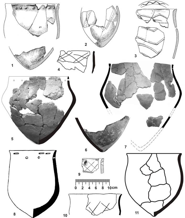 Рисунок 3 – Ранняя керамика Среднего Дона, карамышевская культура. 1–4 – Ивница; 5 – Карамышево I; 6–7 – Плаутино; 8–9 – Устье Излегощи 2; 10–11 – Васильевский Кордон 7