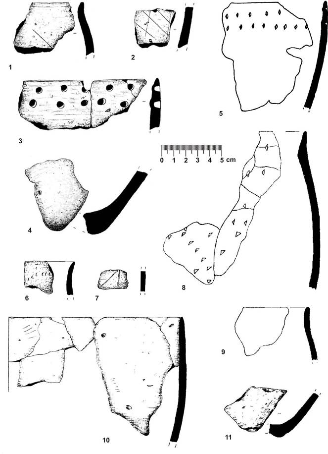 Рисунок 2 – Ранняя керамика лесостепного Поволжья, елшанская культура. 1, 3 – Чекалино IV; 2, 10 – Нижняя Орлянка II; 4 – Ильинка; 5 – Утюж I; 6 – Красный Яр (?); 7 – Вьюново озеро I; 8 – Старая Елшанка II; 9 – Большая Раковка II; 11 – Ивановка