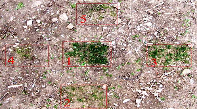 Оценку фитостимулирующих свойств штамма бактерии Rhodococcus erythropolis ВКМ Ас-2017D проводили в полевом эксперименте – в почвенных условиях урбанозёма с высевом газонной травосмеси. На территории Кубанского государственного университета были заложены 5 площадок размером по 0,1 м², на участке урбанозёма с отсутствующей естественной растительностью. Каждая из них засевалась газонной травой и обрабатывалась индивидуально биологическим или химическим агентом каждые 5 дней в течение 20 суток. Участок № 1 – культуральная жидкость, отобранная как супернатант после центрифугирования исходной жидкой культуры; № 2 – биомасса клеток, осажденная ценрифугированием; № 3 – нативная жидкая культура (ЖК) исследуемого штамма; № 4 – раствор химически синтезированной ИУК, равный по концентрации содержанию ИУК в бесклеточной жидкости (50 мг/л); № 5 – контроль (соответствующий объем воды) (рис. 2).