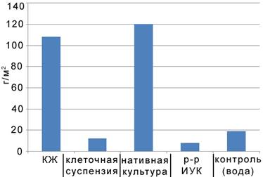 Ввиду того, что субстрат, освещённость и влажность на всех площадках были одинаковыми, различия массы всходов на момент окончания эксперимента – показатель влияния вносимых агентов. Газонная трава, обработанная культуральной жидкостью с клетками и без клеток, демонстрировала выход фитомассы более 100 г/м². В свою очередь участок с газоном, в который вносились суспендированные клетки, имел массу до 20 г/м² (рис. 3). Это говорит о решающем значении внеклеточных метаболитов исследуемого микроорганизма при оценке его фитостимулирующих свойств. Однако роль ИУК неоднозначна, так как участок, который обрабатывался химически полученным фитогормоном, схожих результатов не показал. Вероятно, метаболиты бактерии Rhodococcus erythropolis ВКМ Ас-2017D содержат дополнительные факторы, оказывающие прямое или опосредованное влияние на растения.