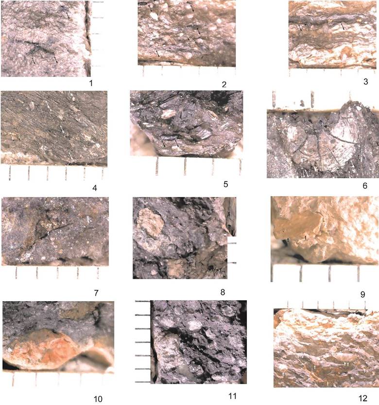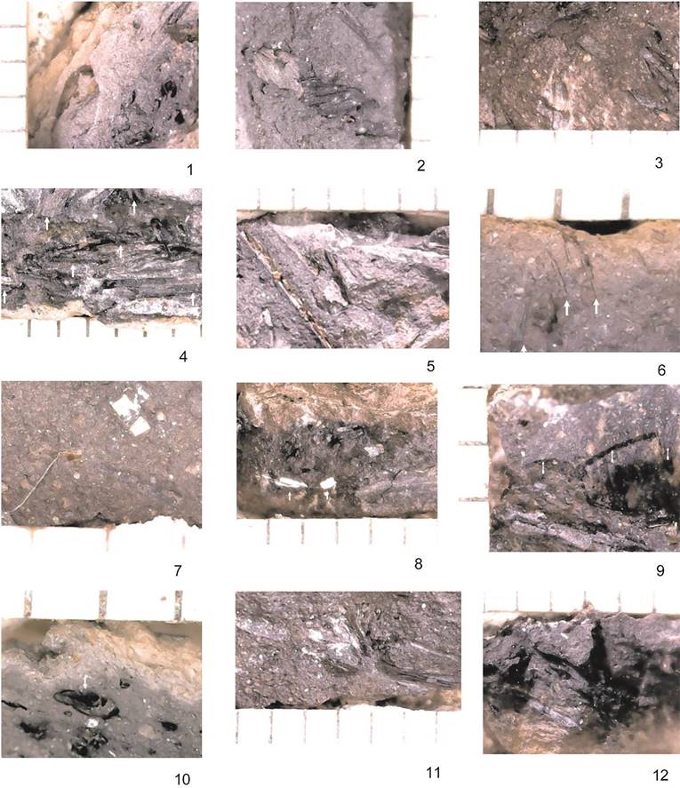 Рисунок 1 – Микрофотосъемка неолитической керамики стоянки Ракушечный Яр: исходное пластичное сырье и формовочные массы: 1–2 – «жирные» илы; 3 – «тощий» ил; 4–6 – отпечатки растительности в ИПС; 7–8 – включения естественной раковины в илах; 9 – фрагмент чешуи рыбы; 10 – фрагмент кости рыбы; 11–12 – органический раствор