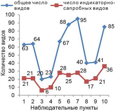 Рисунок 1 – Сравнительное изменение общего числа видов и индикаторно-сапробных видов в наблюдательных пунктах среднего течения реки Зарафшан