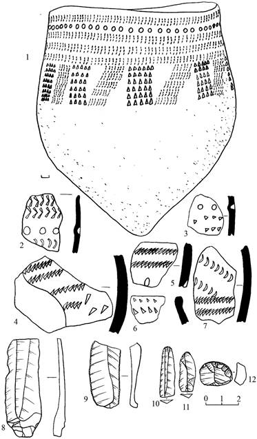 Рисунок 7 – 1–3 – поселение Рыбное Озеро 2; 4–12 – поселение Рыбное Озеро 1. Материалы среднедонской культуры
