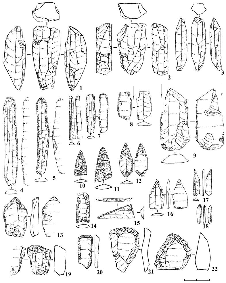 Резцы угловые (рис. 1, 8, 9) – 7 экз., среди них: с одним резцовым сколом – 6 экз., с двумя лезвиями – 1 экз. Два резца на продольных сколах. Пластинки с выемками – 2 экз. Неглубокие выемки оформлены крутой ретушью со спинки. Геометрические микролиты (рис. 1, 15) – 1 экз. представлены обломком или заготовкой асимметричной трапеции или треугольника. Длинная скошенная грань оформлена крутой ретушью со спинки, короткая – без ретуши. Пластина с обработанным крутой ретушью торцом и мелкой ретушью по двум краям со спинки. Острия (рис. 1, 16–18) – 7 экз., из них 3 экз. – на микропластинках с притупленной вертикальной ретушью спинкой и выведенным на острие необработанным краем; 5 экз. – симметричные, среди которых одно образовано крутой ретушью со спинки, другое ретушью со спинки и брюшка, два – ретушью с брюшка. Одно острие на тонком мелком отщепе с ретушью по двум краям со спинки. Сверла – 3 экз. на пластинах с рабочим лезвием, обработанным характерной ретушью и разворотом рабочего края. Развертки (перфораторы) – 2 экз. с характерной противолежащей ретушью на верхней части пластинки возле ударного бугорка. Наконечники стрел (рис. 1, 10–12, 14) – 6 экз. Два экземпляра – на пластинах: один целый, с обработанными со спинки и брюшка плоской приостряющей ретушью пером и насадом; другой с обломанным пером, обработанным крутой ретушью со спинки и плоской ретушью с брюшка и насадом, оформленным плоской прилежащей ретушью. Двустороннеобработанные наконечники – 4 экз. Один почти целый, только с обломившимся кончиком пера, два обломка пера и часть тела наконечника с насадом. Скребки концевые (рис. 1, 20) – 17 экз. на средних и удлиненных проксимальных и медиальных сечениях, рабочий край прямой – 9 экз., округлой – 5 экз. и скошенной – 3 экз. формы. Один скребок дублированный, один выполнен на продольном сколе с нуклеуса (рис. 1, 19). Дополнительную подработку ретушью по одному краю со спинки имеют 7 экз., по одному краю с брюшка – 1 экз.; по двум краям со спинки – 5 экз., подработка прилежащей ретушью – 1 экз.