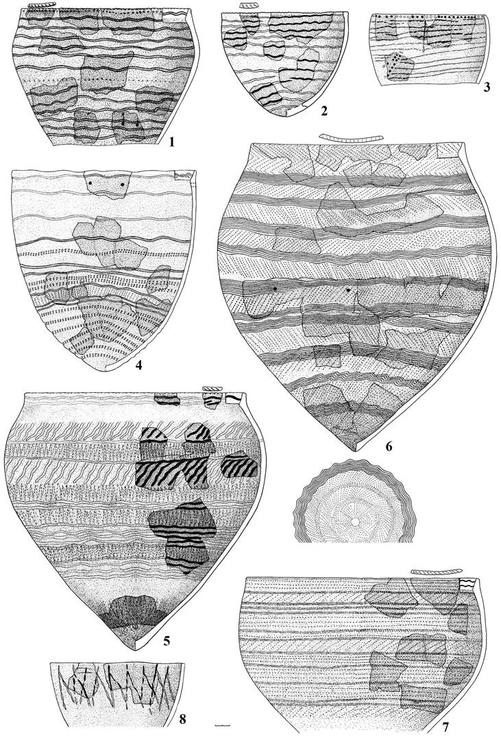 Полуденский комплекс [1; 11] представлен 14 сосудами (рис. 2, 4–7). Принципиально важно отметить, что остатки нескольких сосудов полуденской традиции вместе с каменным инвентарем были зафиксированы в сохранившихся неолитических слоях или же залегали прямо на скале. Сохранность сосудов этого комплекса значительно лучше, чем козловских: развалы крупных форм насчитывают сотни фрагментов; 8 сосудов реконструированы полностью, 5 – наполовину или две трети. Тесто сосудов с примесью талька, иногда с очень крупными фракциями, поверхность сосудов гладкая. Среди форм сосудов данной традиции можно выделить как крупные яйцевидные, так и прямостенные. Встречены миниатюрные сосудики открытой формы. О форме дна можно говорить как о предположительно круглодонной, три сосуда имеют конусовидные или близкие к ним очертания донцев.