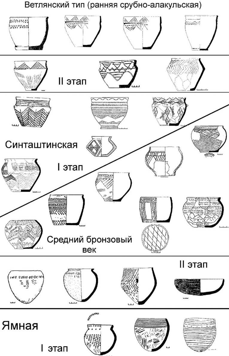 Расцветом конструктивного разнообразия керамики и типообразования явился конец средней – начало поздней бронзы, что отражают керамические традиции потаповских, синташтинских, некоторых абашевских и раннесрубных памятников. Именно в этот период распространяются наиболее сложные формы и появляются новые конструкции. Наиболее сложна и орнаментация керамики указанных культур. При общей близости традиций Заволжья и Приуралья, самые сложные, нестандартные варианты глиняной посуды фиксируются в пограничье ландшафтных зон степи и лесостепи.