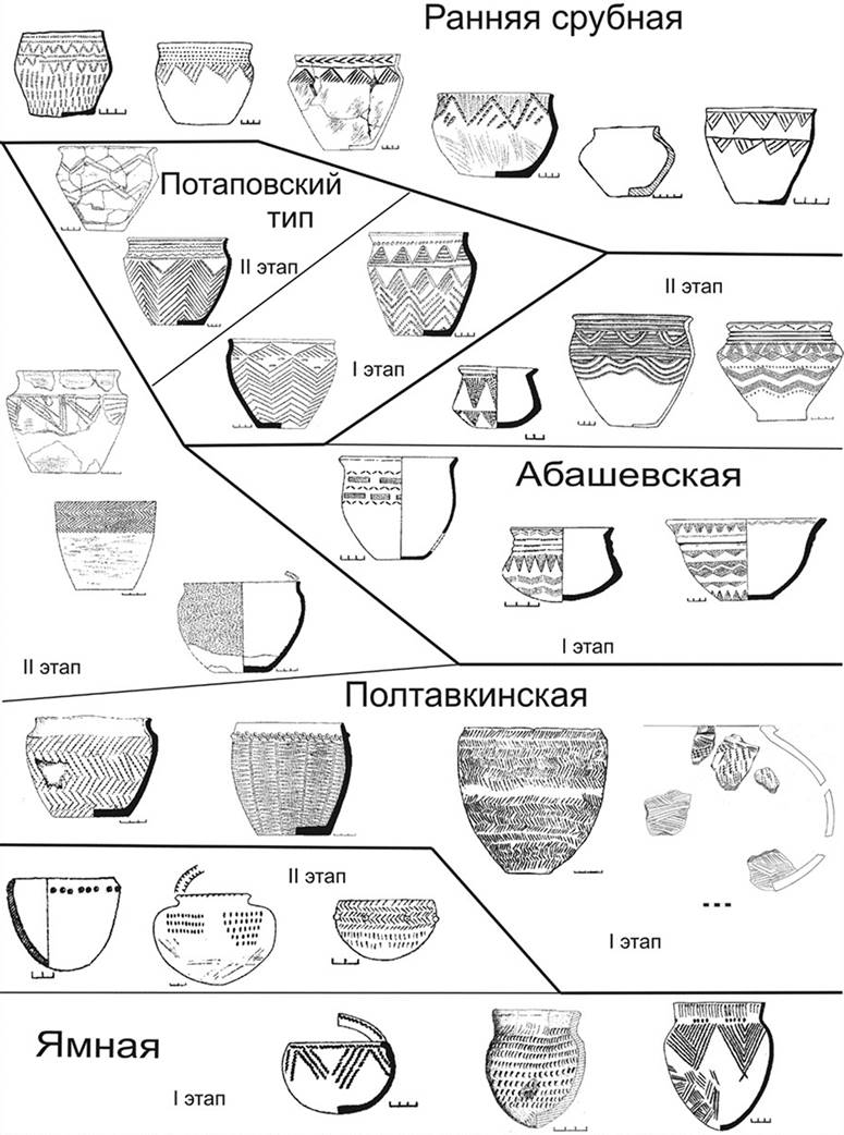 Потаповский керамический комплекс сформировался на основе полтавкинских и, видимо, волго-донских традиций при участии южноуральских абашевских и синхронных синташтинских, формирующихся параллельно. Не исключено, что в сложении керамики «потаповки» и «синташты» очень важную роль сыграли транскультурные близкие по происхождению постъямные группы населения, представленные в различных культурах степи – юга лесосотепи Поволжья, Подонья и Предкавказья, изготавливающие определенные типы «елочной» керамики и керамики, орнаментированной треугольниками. Ярко представлена группа, отражающая переход к срубным и андроновским стандартам. Керамика западных синташтинских памятников близка потаповской, но менее выражены полтавкинский и абашевский компоненты. Оснований для их четкого хронологического разделения с потаповскими нет. Сложение этой группы, как и всей «синташты», связано как с местными волго-уральскими и зауральскими культурами, так и с вероятным влиянием традиций Средней Азии и Кавказа, которые являлись «катализатором» некоторых изменений в формах, реже в декоре.