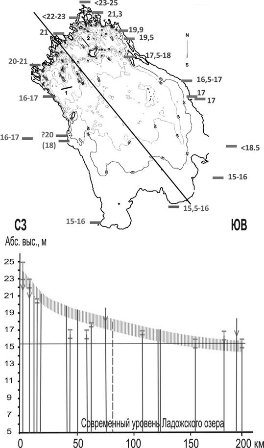 Участок 3. Вопрос о переходе Ладожского бассейна из стадии бессточного, в течение ЛТ, в сточный в ее конце, обсуждался на протяжении ста лет. Диапазон мнений о начале стока из ЛО и возникновении р. Невы колебался от представления о существовании р. Невы «всегда» (Н.Н. Верзилин) до суждения о ее возникновении в IX в. н.э. (Д.Д. Квасов). Ныне, на основе комплексного изучения уровней и разрезов по периферии ЛО, с набором датировок по ¹⁴С, обоснованным признано начало спуска уровня ЛО (прорыв Невы) 3,1–3,0 л.н. Это обосновывалось в начале 70-х гг. XX в. М. Саарнисто, А.А. Лийва, Г.С. Бискэ, И.М. Экманом и др. (рис. 1, 2) и теперь закреплено в обобщающих работах по региону [12]. Начиная с первых работ cкандинавских исследователей (G. De Geer, J. Ailio), речь шла о переливе вод озера через порог стока вблизи нынешних Ивановских порогов за счет послеледникового постепенного, но неравномерного в пространстве с перекосом к ЮВ, поднятия ЮВ фланга области оледенения. Представление о спокойном переливе вод озера в ходе ЛТ (К.К. Марков, Д.Д. Квасов, П.М. Долуханов и мн. др.) вполне умозрительно. Оно не раскрывает механизма события и несостоятельно уже потому, что уровень Ладоги в максимум ЛТ достигал 15(-16) м (рис. 1), тогда как порог стока находился на 2–3 м выше. Перелив и последовавший быстрый спуск вод Ладоги мог осуществиться только при сильном, внезапном и скачкообразном возмущении водных масс озера и их мощном боковом натиске в горловину залива, с превышением озерного уровня не менее чем на 5 м. Это был моментальный прорыв, породить который могло только мощное цунами в узком дефиле [9]. Согласующиеся на разных берегах ЛО датировки, не менее чем в 10–15 местах по периметру бассейна, максимума ЛТ определяют время максимума 3,1–3,0 тыс. л.н., с последующим очень быстрым спуском уровня. Этим же временем теперь датируется мощное сейсмическое событие в бассейне с эпицентром у западного побережья [2].