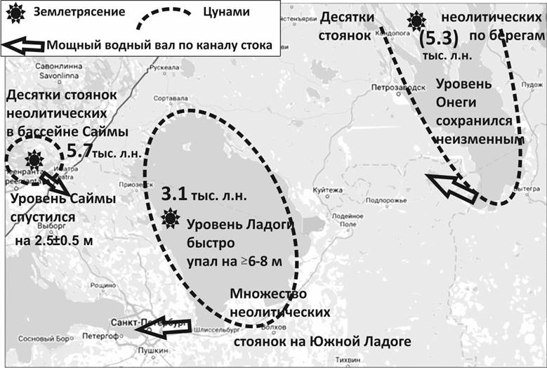 Именно в это время фиксировано разрушение и прекращение обитания ряда неолитических поселений на Ю побережье ЛО в Подолье, в устьях рр. Волхов, Сясь, на р. Свирь (Негежема), а также, вероятно, по Неве у Ивановских порогов. Считать это случайным совпадением трудно. Едва ли не решающим аргументом в пользу признания возникшего в это время в бассейне катаклизма служат материалы в [8] в интерпретации автора [9] и наблюдения в большом разрезе в низовьях р. Оять [13].