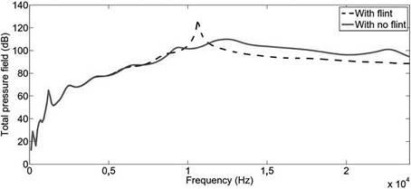Figure 1 – Prediction of the total pressure field resulting from the insonification of a flint blade embedded 5 cm into a cultural layer. The simulated acoustic source and hydrophone are placed above the seabed, symmetrically about the flint piece, with an incidence angle of 5°. The sea-floor model consists of thin layers of sand and mud overlying the cultural layer, a thin underlying sand layer and moraine substrate. The red curve is the returned signal spectrum with no flint embedded in the cultural layer, while the black curve is the spectrum with a flint blade embedded. The resonance frequency is 10,6 kHz.15 [7]