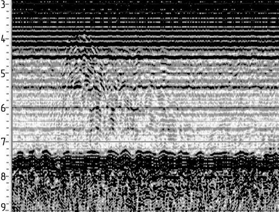 Line 13 (fig. 6) runs parallel with the line of targets from ENE to WSW and records a response over 7 m, from the first to the last peak. Unfortunately, the low precision of the navigation does not permit identification of which samples are producing which responses. A significant variation in the height of the haystack phenomenon can be observed, which must be related to the variation in the samples. It is, however, impossible to relate this variation to specific samples.