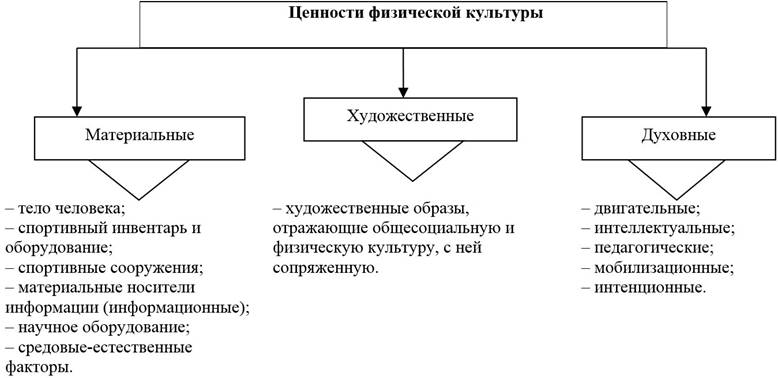 Исходя из того, что культура явно проявляется в материальной, духовной и художественной сферах социума [4], всю совокупность ценностей физической культуры следует представить соответственно группами материальных, духовных и художественных ее ценностей (рис. 1).