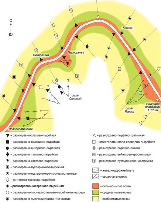 Из 16 растительных ассоциаций на всем протяжении исследованных участков в непосредственной близости от полотна произрастает ассоциация Elytrigieta-poosum heteroherbosum, которая создает своего рода переходную полосу от сорного типа растительности к естественному фитоценозу, характерному тому или иному участку. Также стоит отметить распространение данной ассоциации по осыпающимся склонам оврагов и грунтовым дорогам, пересекающим полотно, что указывает на ее приуроченность к наиболее нарушенным местам обитания (рис. 2).