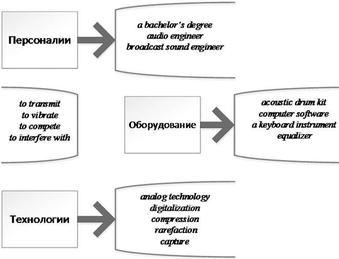 Этап 2. Выявление инвариантного тезауруса профессионального общения с учетом специфики [9]. Эта процедура будет более эффективна, если заранее кластеризовать тезаурус. Для аудиоинженеров необходимую лексику можно сгруппировать, например, так, как представлено на рис. 1.