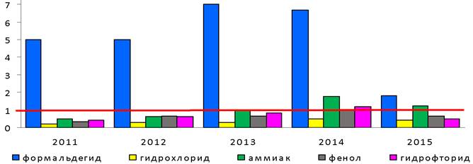 В этой связи представляется важным обратить внимание на повышенное содержание в атмосфере города формальдегида, который относится ко 2 классу опасности и обладает высокой токсичностью. Высокая концентрация этого вещества угнетающе действует на центральную нервную систему, могут поражаться слизистые оболочки глаз и верхних дыхательных путей. Наиболее существенное влияние его повышенное содержание может оказать на здоровье детей [13].