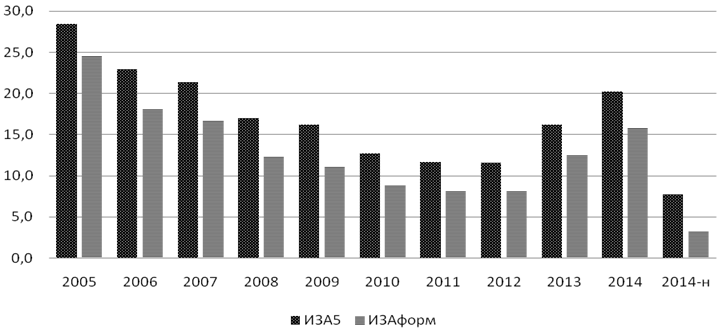Учитывая, что влияние качества воздуха на здоровье человека имеет пролонгированный характер, имеет смысл оценить тот его показатель, который в первую очередь учитывается при оценке годовой степени загрязненности – индекс загрязнения атмосферы ИЗА. Расчеты показали, что наибольший вклад в загрязнение воздуха города вносят формальдегид, диоксид азота, пыль, оксид углерода и фенол, при этом в расчетах мы использовали неизмененный ПДК с.с. формальдегида за 2014 год. Для Саратова, где наибольший вклад в загрязнение воздуха вносит именно формальдегид, методы расчета имеют большое значение, так как занижение показателей лишь маскирует проблему, не устраняя ее (рис. 4). Согласно новой методике расчета ИЗА формальдегида упал в 5 раз, а комплексный показатель ИЗА₅ снизился почти в 3 раза. При этом, согласно данным Росгидромета [11], за период с 2010 по 2014 гг. концентрация в атмосфере формальдегида увеличилась. Ежегодный отчет Росгидромета [12] приводит данные о приоритете формальдегида в перечне основных загрязнителей атмосферы многих городов России, однако Саратов назван в числе городов с максимальным превышением содержания этого веществ даже с учетом изменения ПДК с.с.