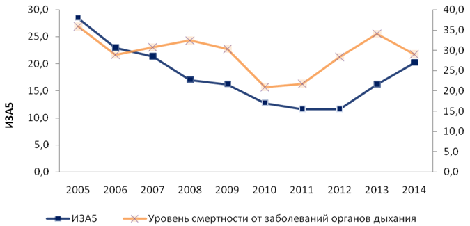 Рисунок 5 – Динамика изменения ИЗА₅ и уровня смертности от заболеваний органов дыхания, г. Саратов, 2005–2014 гг.