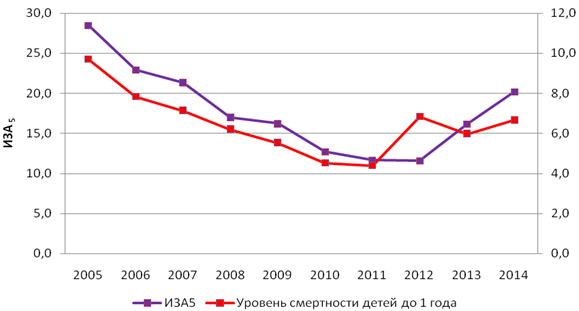 Рисунок 6 – Динамика изменения ИЗА₅ и уровня смертности детей до 1 года, г. Саратов, 2005–2014 гг.