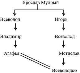 В 1116 г. дочь Мономаха Агафья вышла замуж за Всеволодка Городенского [8, стб. 284]. Последнего обычно считают сыном Давыда Игоревича. Такая трактовка является ошибочной. Не вдаваясь здесь в аргументацию, которая приведена в другой статье, отметим, что, по нашему мнению, Всеволодко – сын племянника Давыда Игоревича Мстислава Всеволодовича [11, с. 9–13]. Это также 7-я степень родства (рис. 4).