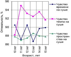 Рисунок 1 – Возрастная динамика проявления у юных пловцов чувства времени, темпа и пространства на суше.