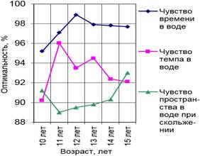 Рисунок 2 – Возрастная динамика проявления у юных пловцов чувства времени, темпа и пространства в воде