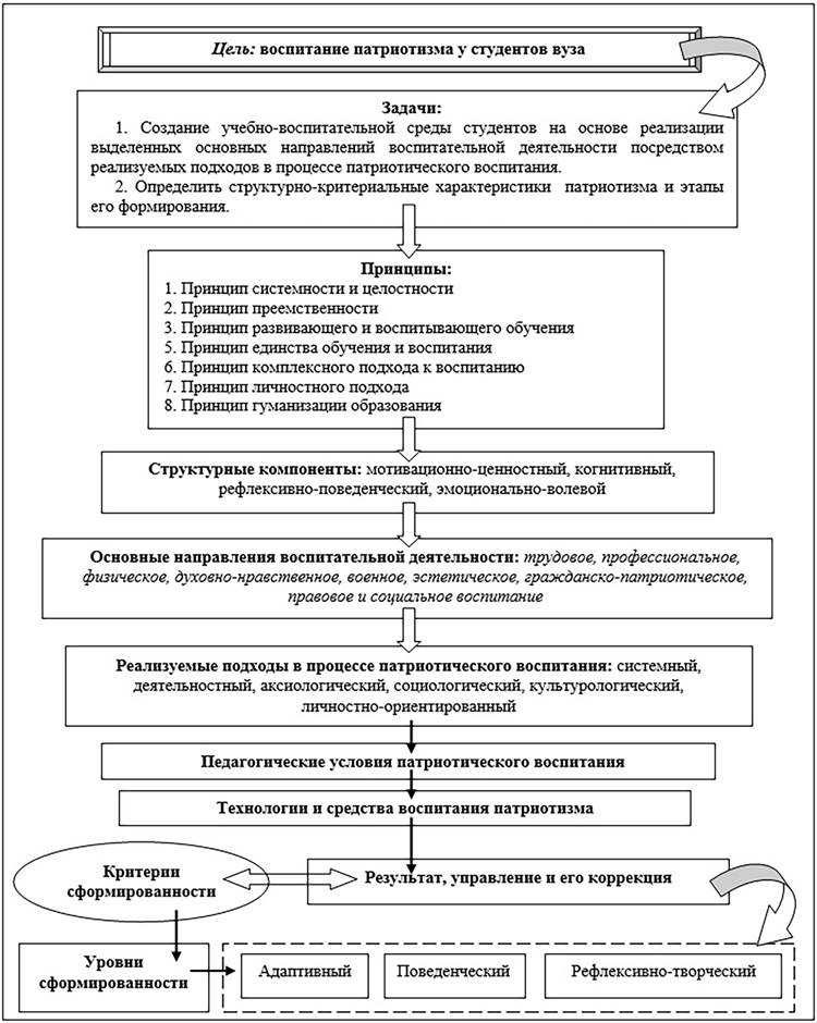 В частности, профессиональные аспекты в контексте воспитания в образовательных учреждениях с казачьим компонентом рассматривались в работах [10–14]. Поскольку воспитание представляет собой определенную систему [2], то это требует прежде всего моделирования системы патриотического воспитания у студентов в образовательном пространстве вуза с казачьим компонентом. Проблемы патриотического воспитания в различных образовательных учреждениях рассматривались многими авторами [9; 15–25].