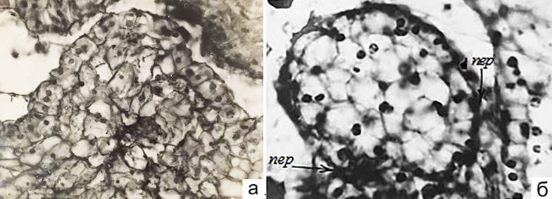 Рисунок 2 – Разные стадии формирования эмбриоидов на партеногенетическом зародыше линии кукурузы АТ-1 in vitro: а – стадия «бугорка»; б – появление перетяжки (пер), начало обособления от ткани материнского зародыша